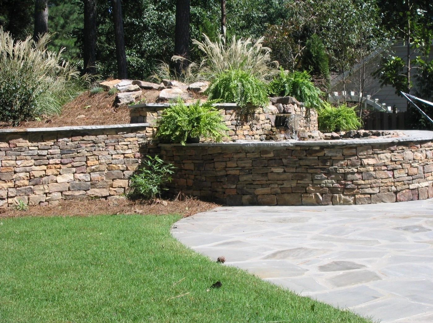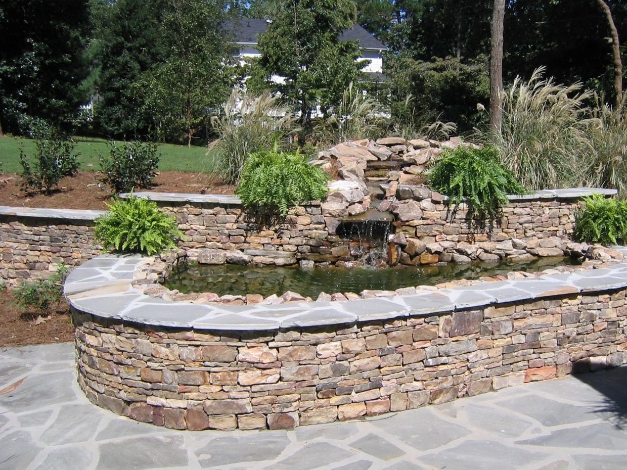 Every so often we design project that are very overgrown and in need of complete transformations. This was one of those projects. In a lovely older Dunwoody neighborhood, surrounded by beautiful mature Oaks, Magnolias and Maples. As you approach the rear yard from the driveway, your attention immediately draws you to the right where the fun begins. A beautiful stainless arbor frames the entry surrounded by a mix perennial and annual color. All based with a stunning bluestone walk that fades into a larger patio space and a small lawn. As you approach the main feature, a waterfall and raised koi pond, the noise of trickling water invites you in. The upper level of the terrace is a large lawn space to me used by our client's grand children and pets. A thoroughly relaxing outdoor garden space for all to enjoy for generations to come.